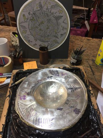 A few of my pieces are just surface chasing, applying the decoration just to the one level, but I’ve also used a different form of chasing where there’s different levels to a piece, by pushing the background down around various parts I want to stand out like around a tree, making it come to life and having more of a three dimensional quality to it. As well as this I will sometimes turn the piece over and push the parts out further, using repoussé punches.